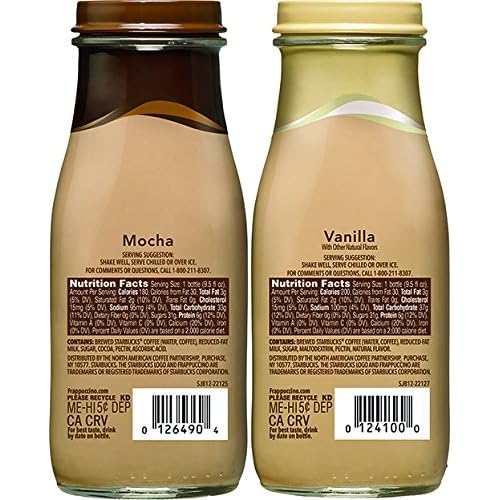 Starbucks Frappuccino, Vanilla, 13.7 oz - amazon.com Discover Vanilla Frappuccino coffee drink, a creamy blend of coffee and milk, mixed with divine vanilla flavor. We use the finest Arabica beans to create a rich and undeniably luscious beverage. This pack includes nine 9.5 oz. glass bottles of Starbucks Mocha Frappuccino and six 9.5 oz. glass bottles of Starbucks Vanilla Frappuccino.