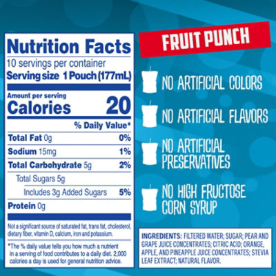 Calories in Capri Sun Fruit Punch and Nutrition Facts - FatSecret Capri Sun Fruit Punch Nutrition Facts Serving Size 1 pouch (331 ml) Amount Per Serving Calories 130 % Daily Values* Total Fat 0.00g 0% Saturated Fat 0.000g 0% Trans Fat 0.000g Cholesterol - Sodium 25mg 1% Total Carbohydrate 34.00g 12% Dietary Fiber 0.0g 0% Sugars 33.00g Protein 0.00g Vitamin D - Calcium - Iron - Potassium -