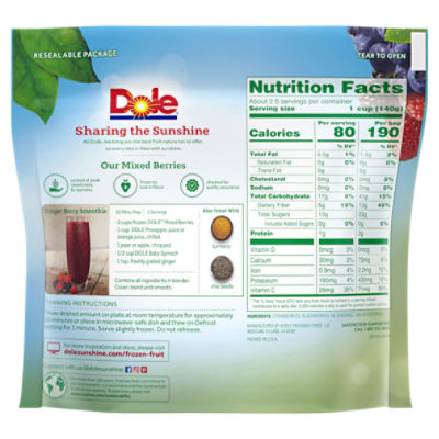 Nutrition Facts for Dole Mixed Fruit • MyFoodDiary® Dole, Mixed Fruit, Frozen, Nutrition Facts, Serving Size, cup, 1 cup = 140g, Amount Per Serving, 70, Calories, % Daily Value*, 0%, Total Fat 0g, 0% Saturated Fat 0g, Trans Fat 0g, 0%, Cholesterol 0mg, 0%, Sodium 0mg, 5%, Total Carbohydrate 16g, 7%, Dietary Fiber 2g, Total Sugars 12g, 0%, Includes 0g Added Sugars, Protein 0.5g, 0% Vitamin D 0mcg,