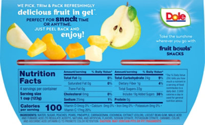 Dole Mixed Fruit in 100% Fruit Juice Cups - 4-4 Oz - Vons Shop Dole Mixed Fruit in 100% Fruit Juice Cups - 4-4 Oz from Vons. ... everywhere with good nutrition! Full Of Sunshine: Bring sunshine with you wherever you go - Dole Fruit Bowls seal in goodness and nutrition. Vitamin C is an antioxidant that helps support a healthy immune system. ... Consult Product label for the most current and accurate ...