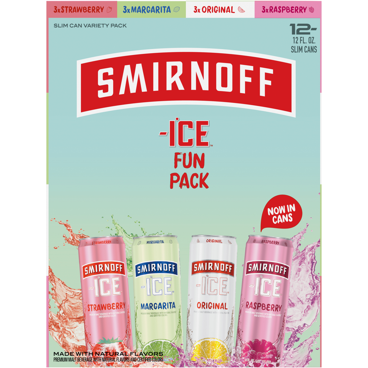Smirnoff Ice | Flavored Malt Beverages | Smirnoff Under 100 calories. Find Near You Learn More. SMIRNOFF ICE 12 oz. can variety pack. Smirnoff Ice 12oz. Can Fun Pack featuring Original, Raspberry, Margarita and Strawberry flavors. ... SMIRNOFF ICE margarita can. A perfect mingling of citrus and tart with a touch of sweetness and salty notes for a deliciously balanced flavored malt beverage.
