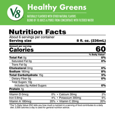 V8 Healthy Greens Vegetable Juice No Sugar Added - Giant Food Stores V8 Healthy Greens Vegetable Juice No Sugar Added 46 oz btl See Best Price Quick Facts Gluten-free Vegetarian Nutrition 60 Calories 0g Sat Fat 180mg Sodium 13g Sugars Nutrition Facts About 6 servings per container Serving Size 8.0 fl oz Amount per serving Calories 60 % Daily Value* Total Fat 0g 0 Saturated Fat 0g 0 Trans Fat 0g Cholesterol 0mg 0