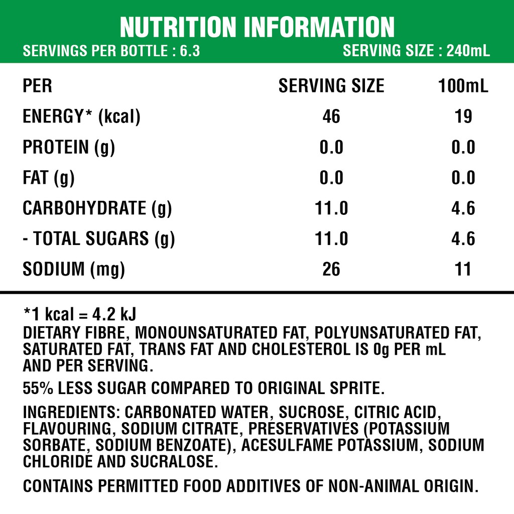 Sprite | Nutrition Facts & Ingredients | Coca-Cola GB Crisp, refreshing and clean-tasting, Sprite is a lemon and lime-flavoured soft drink. It first hit shop shelves back in 1961 and today it's sold in more than 190 countries. Nutrition Information. per 100ml. Energy. 61 kJ / 14 kcal. Fat. 0g. Of which saturates.