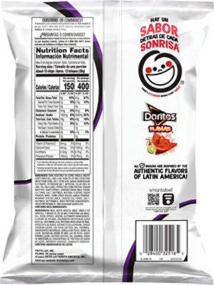 Doritos Tortilla Chips, Flamas, Sazonado Flavored - Instacart Nutrition Facts Serving Size 11.0 chips Servings Per Container 11 Amount Per Serving Calories 140 % Daily Value Total Fat 8g 12% Saturated Fat 1g 5% Trans Fat 0g Cholesterol 0mg 0% Sodium 200mg 8% Total Carbohydrate 16g 5% Dietary Fiber 1g 4% Sugars 0g Protein 2g Percent Daily Values are based on a 2,000 calorie diet. Why Instacart?