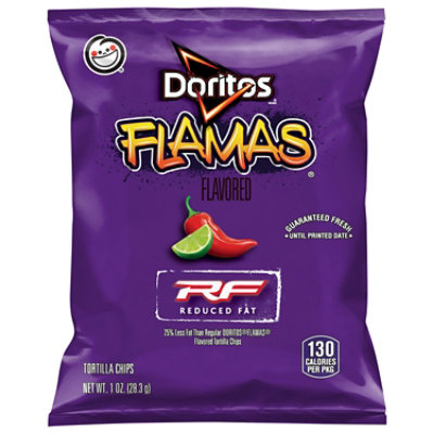 DORITOS® REDUCED FAT FLAMAS® FLAVORED TORTILLA CHIPS - 1OZ. Claims ... *25% Less Fat Than Regular Doritos® Flamas® Tortilla Chips, **Total Fat content of regular Doritos® Flamas® Tortilla Chips is 8g per 1oz. serving. Total Fat content of Doritos® Reduced Fat ® Flamas Tortilla Chips is 5g per 1oz. serving. Nutritional Facts Servings Per Container: 1 Serving Size: 1 package Calories: 130 Nutrient Type Packaged: