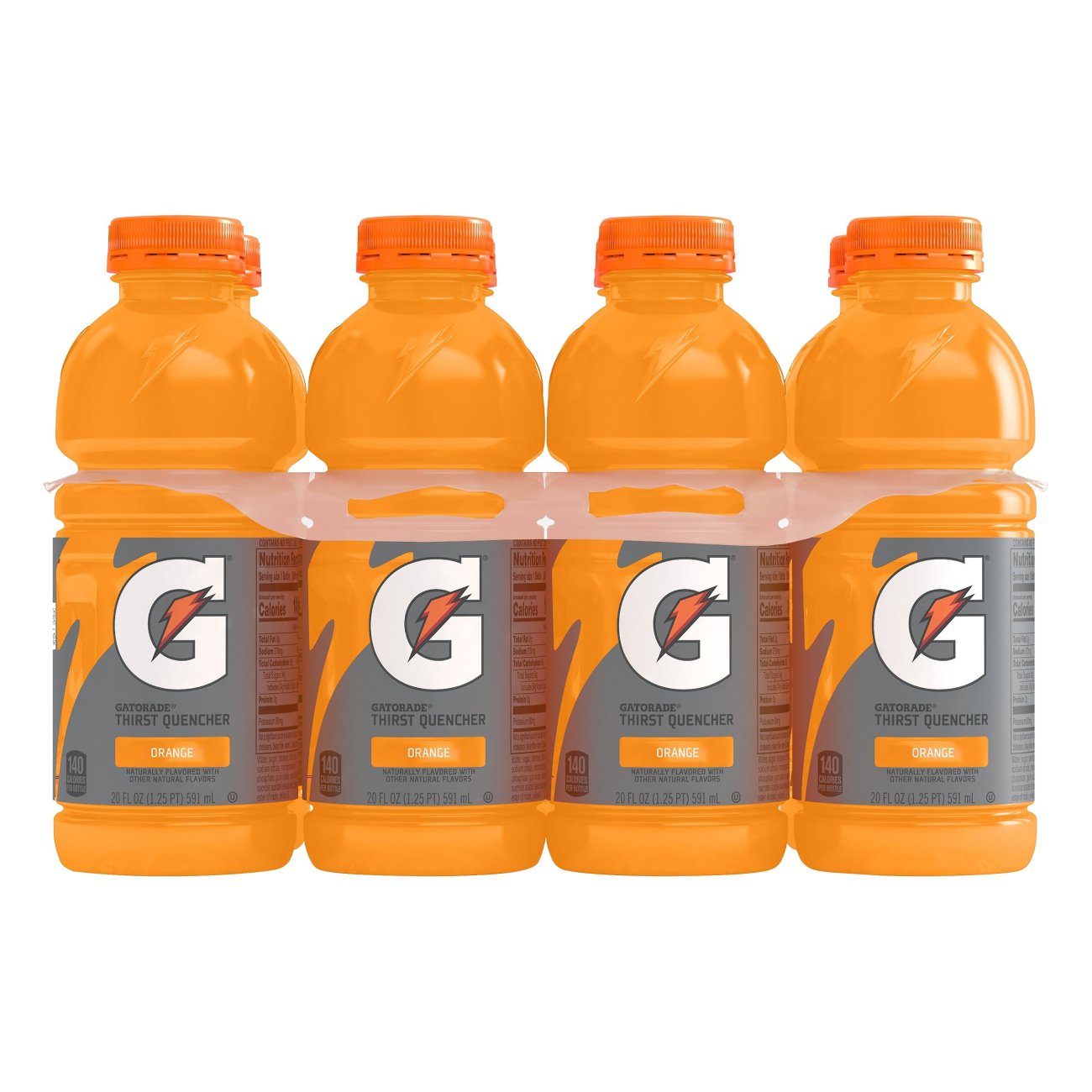 Gatorade Orange Thirst Quencher 20 oz Bottles Nutrition Facts 0 servings per container Serving Size 1.00 bottle Amount Per Serving Calories 140 % Daily Value * Total Fat 0g 0% Sodium 270mg 12% Total Carbohydrate 36g 13% Total Sugars 34g Protein 0g Potassium 80mg 0%