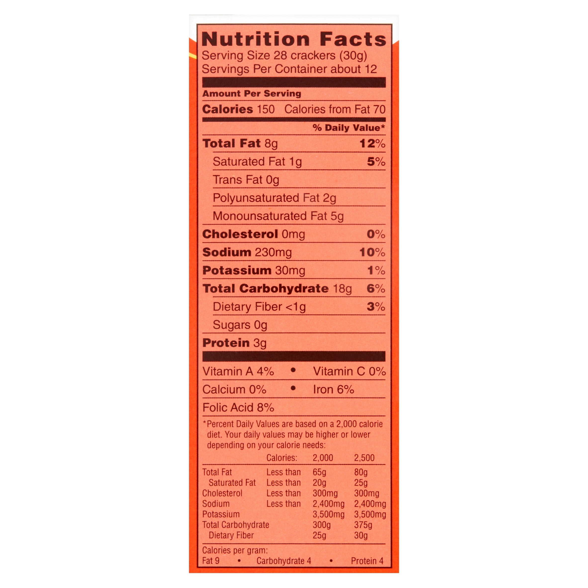 Cheez-It® White Cheddar Baked Snack Crackers | Cheez-It® Ingredients Ingredients: Enriched flour (wheat flour, niacin, reduced iron, vitamin B1 [thiamin mononitrate], vitamin B2 [riboflavin], folic acid), vegetable oil (soybean and palm oil with TBHQ for freshness), white cheddar cheese (milk, cheese cultures, salt, enzymes). Cheez-It® Original | Cheez-It® Ingredients Ingredients: Enriched flour (wheat flour, niacin, reduced iron, vitamin B1 [thiamin mononitrate], vitamin B2 [riboflavin], folic acid), vegetable oil (high oleic soybean, soybean, palm, and/or canola oil with TBHQ for freshness), cheese made with skim milk (skim milk, whey protein, salt, cheese cultures, enzymes, annatto extract color). Nutrition Information for Cheez-It | Our Everyday Life Calories Each 27-cracker serving of Cheez-It original crackers contains 150 calories, including 70 calories from fat. If you consume 2,000 calories a day, every serving of the crackers amounts to 7.5 percent of your total daily intake. Fat Cheez-It crackers contain 8 g of fat per serving. Cheez-It® Original Snack Crackers - SmartLabel™ - Kellogg's Cheez-It® Original Snack Crackers Nutrition Ingredients Allergens Features & Benefits Company, Brand & Sustainability 150 Calories 1.5 g Sat Fat 230 mg Sodium 0 g Sugar Nutrition Facts Servings Per Container About 7 Serving Size 27 Crackers (30 g)